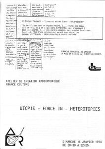 First broadcasting / Primera radiodifusión: 16-1-1994, Atelier de Création Radiophonique (A.C.R.), France-Culture, Radio France