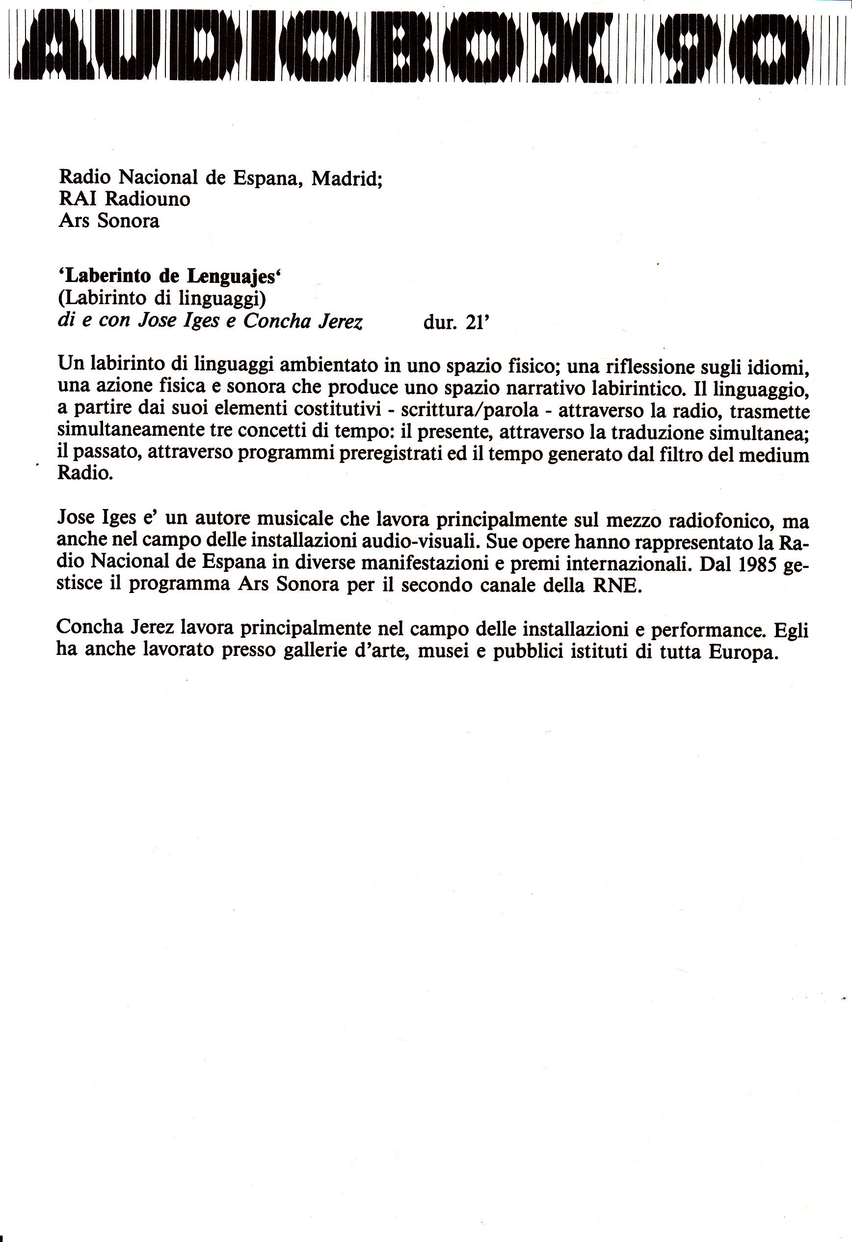 Cada obra de la serie “Laberinto de lenguajes” se desarrolla en un espacio concreto. A partir de ese espacio, de la intervención en vivo de 3 locutores y de dos cintas grabadas se configura un espacio narrativo como interrelación laberíntica de lenguajes en un espacio y tiempo real, virtual, mental. Los lenguajes son aquí como estratos coincidentes en el espacio de la performance y en el de la emisión.